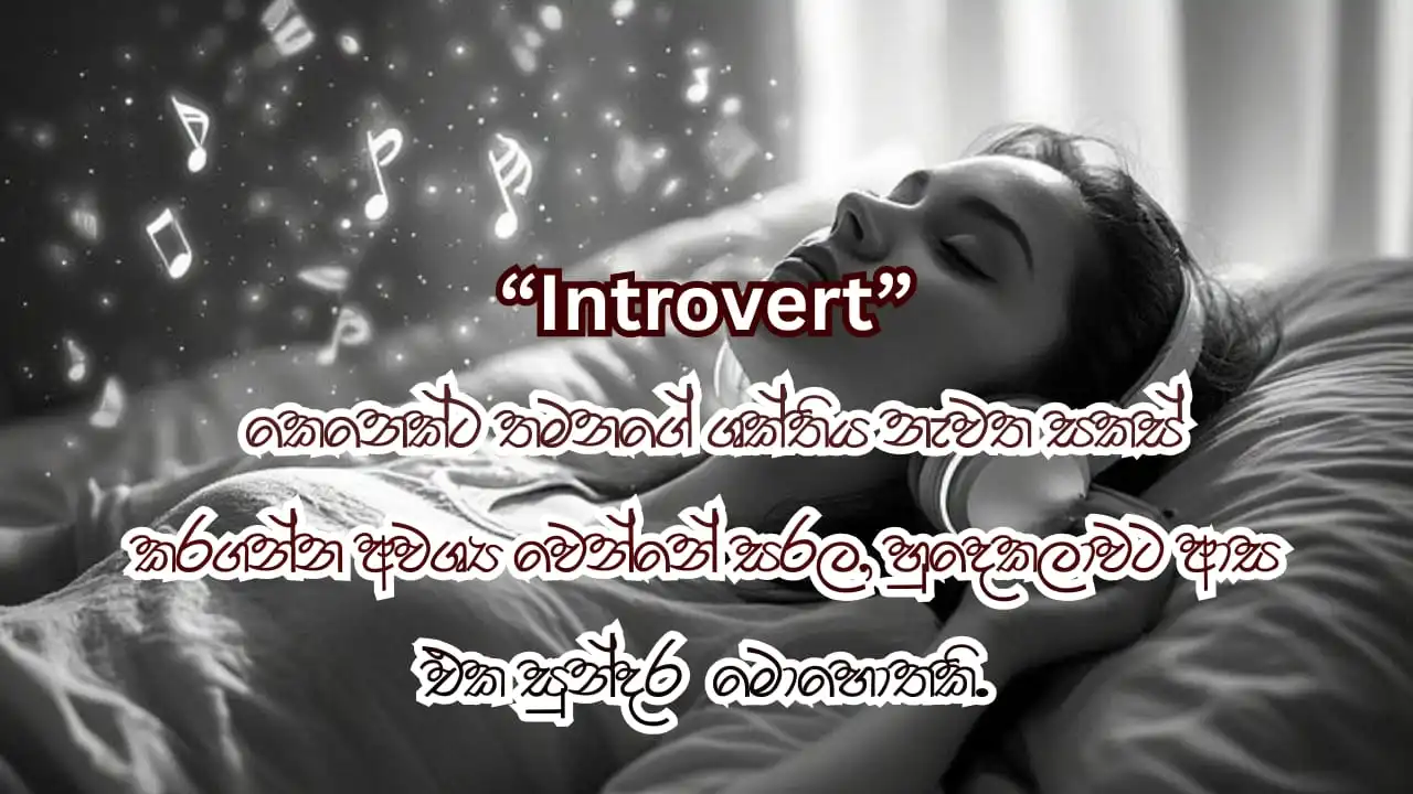 ඔ‍යා Introvert කෙනෙක් නම් මේක ගොඩක් වැදගත් වෙයි.   Introvert කෙනෙක් කියන්නෙ ටිකක් ලැජ්ජාශීලී හුදෙකලාවට වැඩිපුර කැමති කෙනෙක්. එහෙම කෙනෙක්ට recharge වෙන්න මම කලින් කියපු ක්‍රම ගොඩක් වැදගත්.