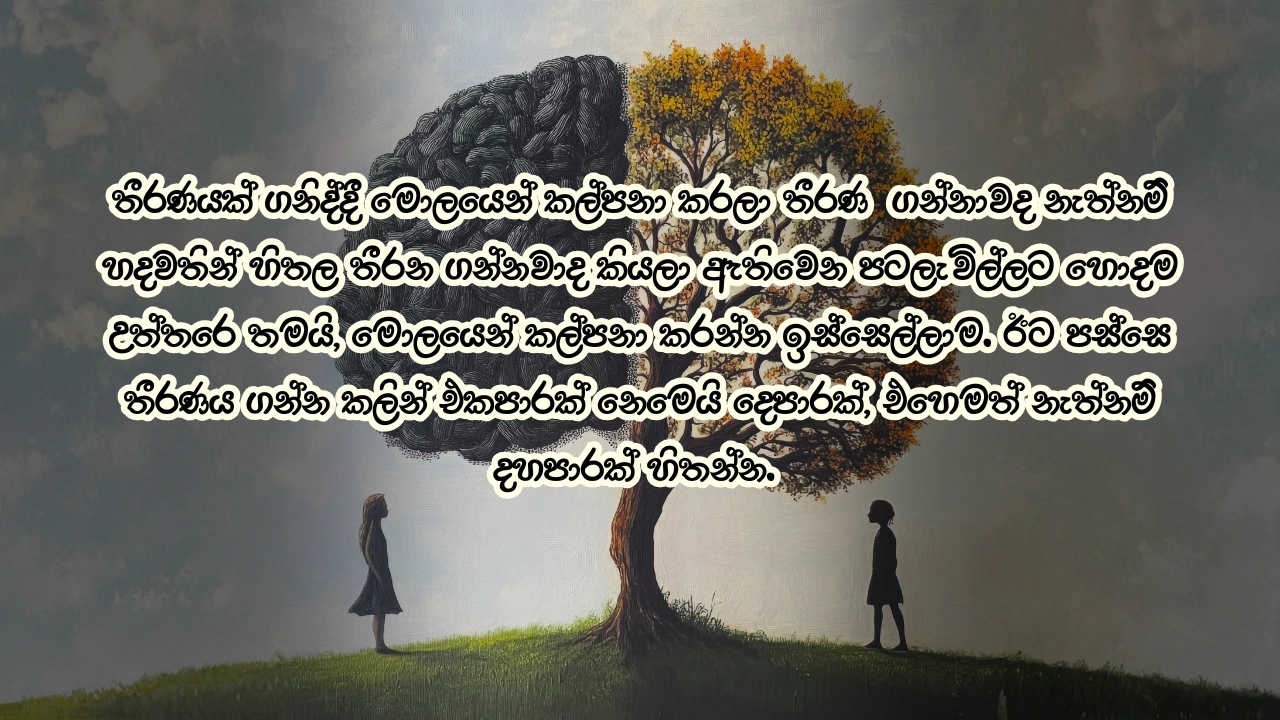 ඒ නිසා  තීරණයක් ගනිද්දී මොළයෙන් කල්පනා කරලා තීරණ ගන්නාවද නැත්නම් හදවතින් හිතල තීරණ ගන්නවාද කියලා ඇතිවෙන පටලැවිල්ලට හොඳම උත්තරේ තමයි, මොළයෙන් කල්පනා කරන්න ඉස්සෙල්ලාම…..ඊට පස්සෙ තීරණය ගන්න කලින් එකපාරක් නෙමෙයි දෙපාරක් එහෙමත් නැත්නම් දහපාරක් හිතන්න ඒ කෙනාගෙ තැන ඉදලා …..ගත්ත තීරණය අනිත් කෙනාට කොහොම දැනෙවිද කියලා.