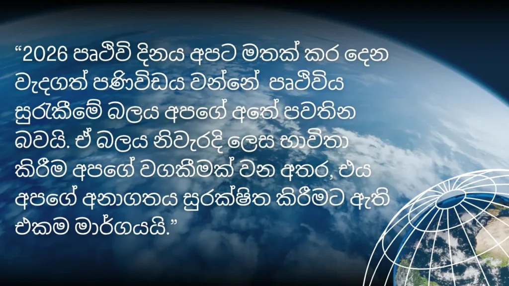 අවසන් වශයෙන්, 2026 පෘථිවි දිනය අපට මතක් කර දෙන වැදගත් පණිවිඩය වන්නේ පෘථිවිය සුරැකීමේ බලය අපගේ අතේ පවතින බවයි. ඒ බලය නිවැරදි ලෙස භාවිතා කිරීම අපගේ වගකීමක් වන අතර, එය අපගේ අනාගතය සුරක්ෂිත කිරීමට ඇති එකම මාර්ගයයි.