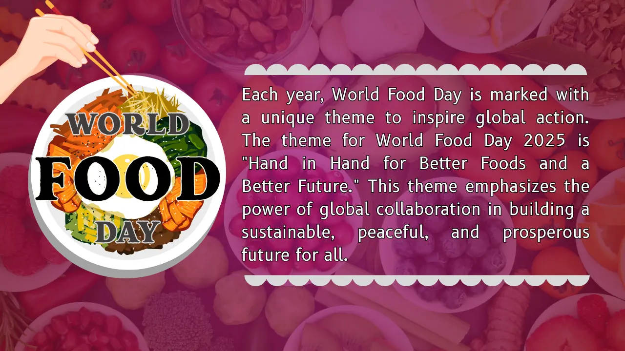 Each year, World Food Day is marked with a unique theme to inspire global action. The theme for World Food Day 2025 is “Hand in Hand for Better Foods and a Better Future.” This theme emphasizes the power of global collaboration in building a sustainable, peaceful, and prosperous future for all. It advocates for transforming food systems in a way that ensures everyone has access to nutritious food while living in harmony with the planet.