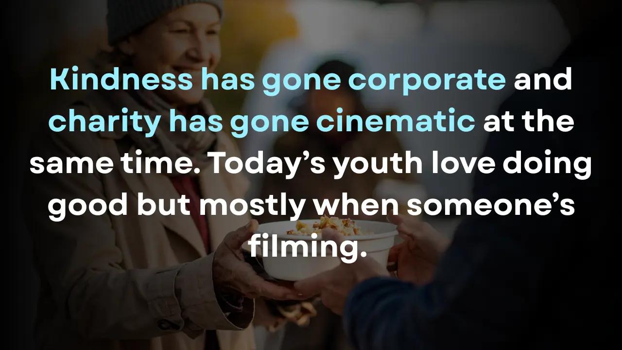 Kindness has gone corporate and charity has gone cinematic at the same time. Today’s youth love doing good but mostly when someone’s filming. They’ll hand out food to the homeless with a tripod and post it with a caption like,