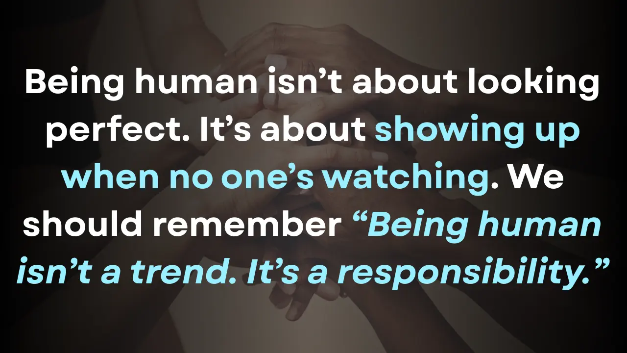 I have a huge respect to those people. Because they remind us that being human isn’t about looking perfect. It’s about showing up when no one’s watching. We should remember “Being human isn’t a trend. It’s a responsibility.”
