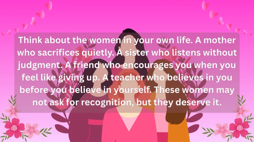 Think about the women in your own life. A mother who sacrifices quietly. A sister who listens without judgment. A friend who encourages you when you feel like giving up. A teacher who believes in you before you believe in yourself. These women may not ask for recognition, but they deserve it.