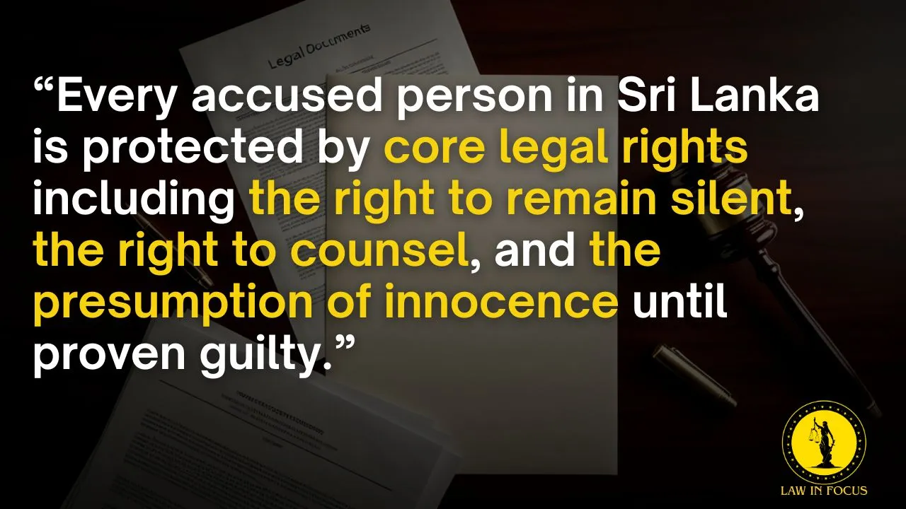 Sri Lankan law guarantees several rights to individuals accused of crimes. These include the right to remain silent, the right to legal representation, the right to a fair and public trial, and the presumption of innocence until proven guilty. These rights are enshrined to protect individuals from wrongful conviction and to maintain the integrity of the justice system.